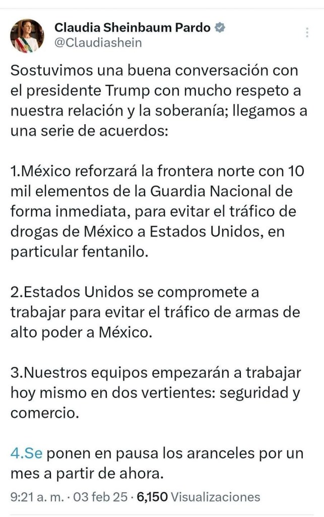 Se ponen en pausa un mes los aranceles y se revisan temas de tráfico de armas y drogas, así como también se reforzará la seguridad en la frontera norte de México con 10 mil miembros de la Guardia Nacional.
