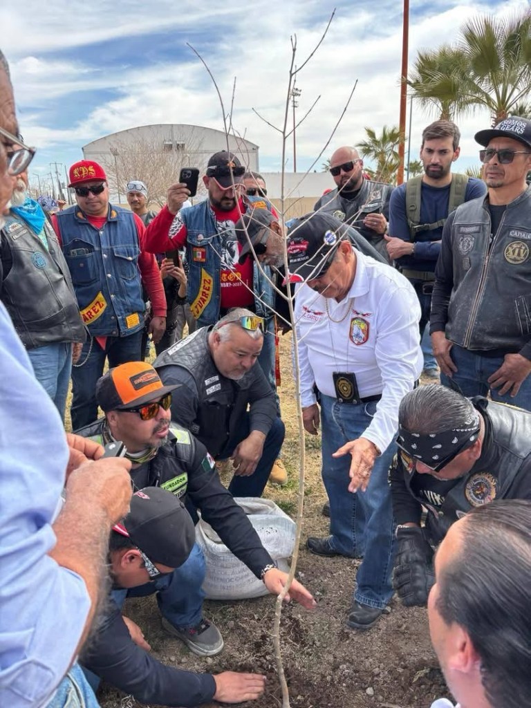 Club de motociclistas y cadetes de Servicio Militar Nacional participaron excavando fosas para sembrar fresnos, duraznos y pistaches en distintas áreas del parque.