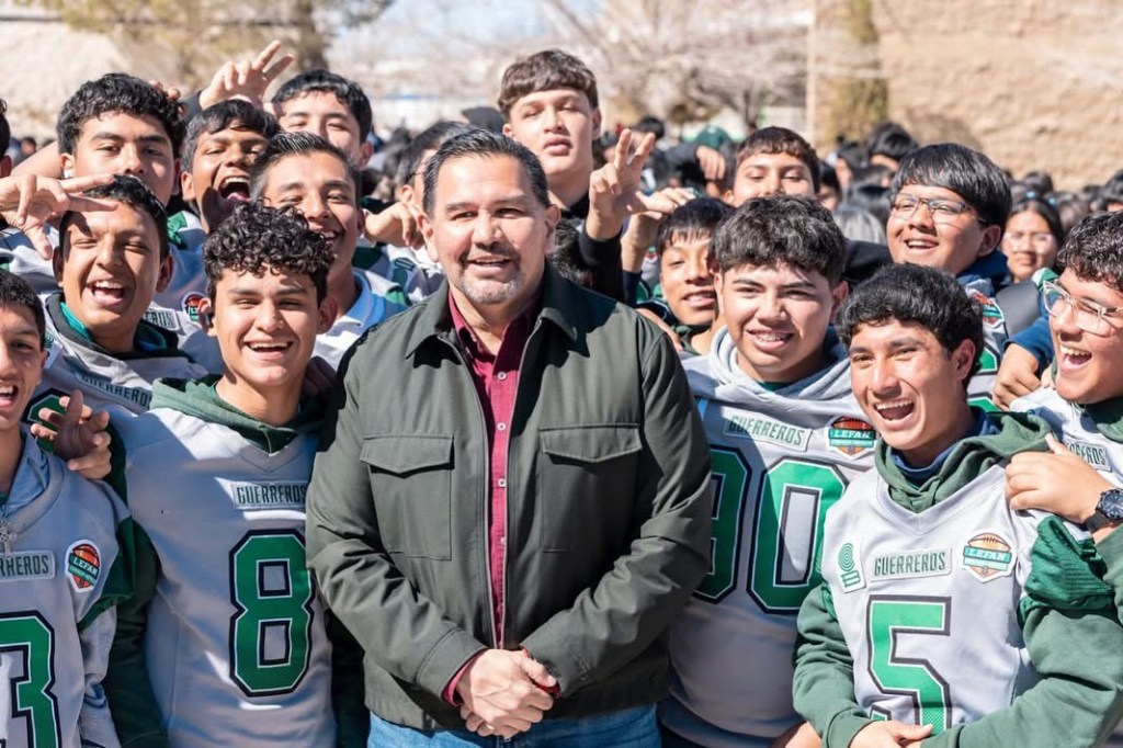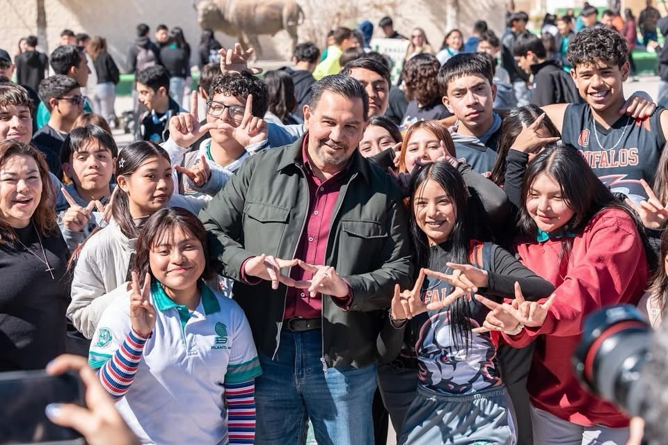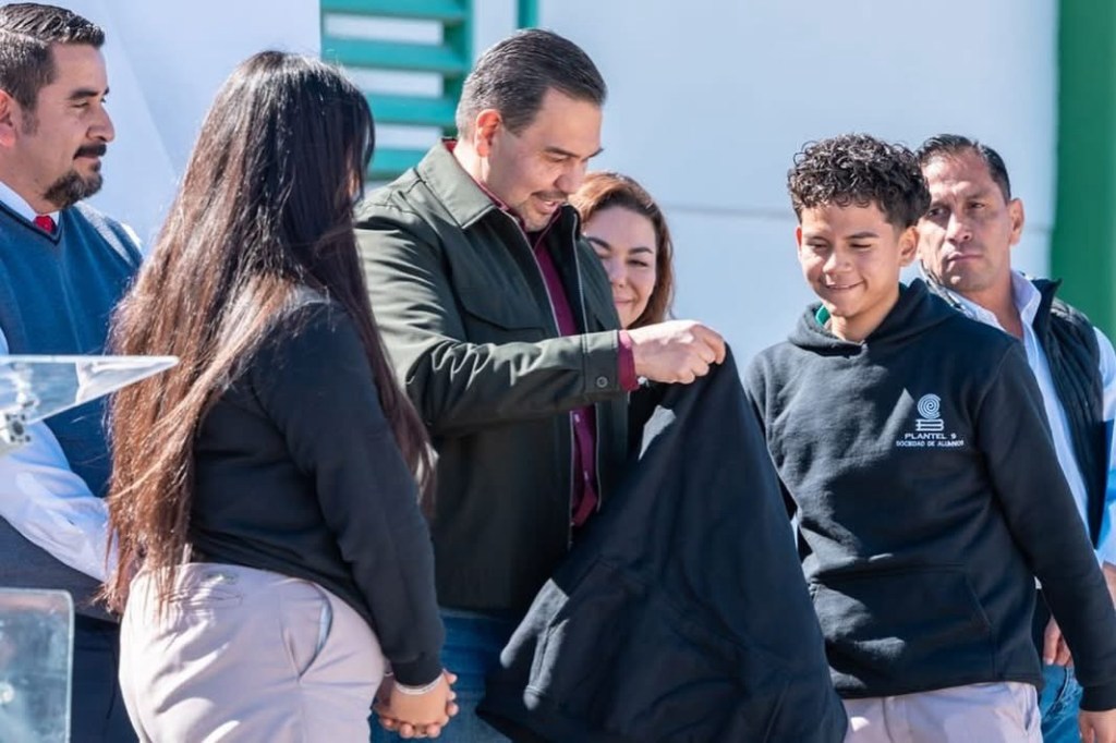 Cómo agradecimiento por apoyar a su escuela, estudiantes y docentes le regalaron una sudadera del bachi al alcalde Cruz Pérez Cuéllar por invertir en mejorar su escuela.