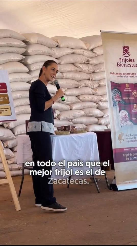 “Lo vamos a empaquetar como: ‘Frijol del Bienestar producido en Zacatecas’ Se garantizará un buen precio y su distribución. Aquí en Zacatecas se va a vender igual que en todo el país”, dijo la mandataria en gira de trabajo por dicho estado.