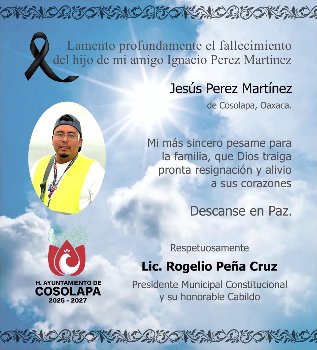 Mediante una esquela en la página oficial del Municipio de Cosolapa, Oaxaca, el presidente municipal Rogelio Peña lamentó el fallecimiento de Jesús Pérez Martínez el día de ayer a consecuencia de un accidente de trabajo en esta ciudad.