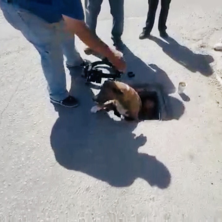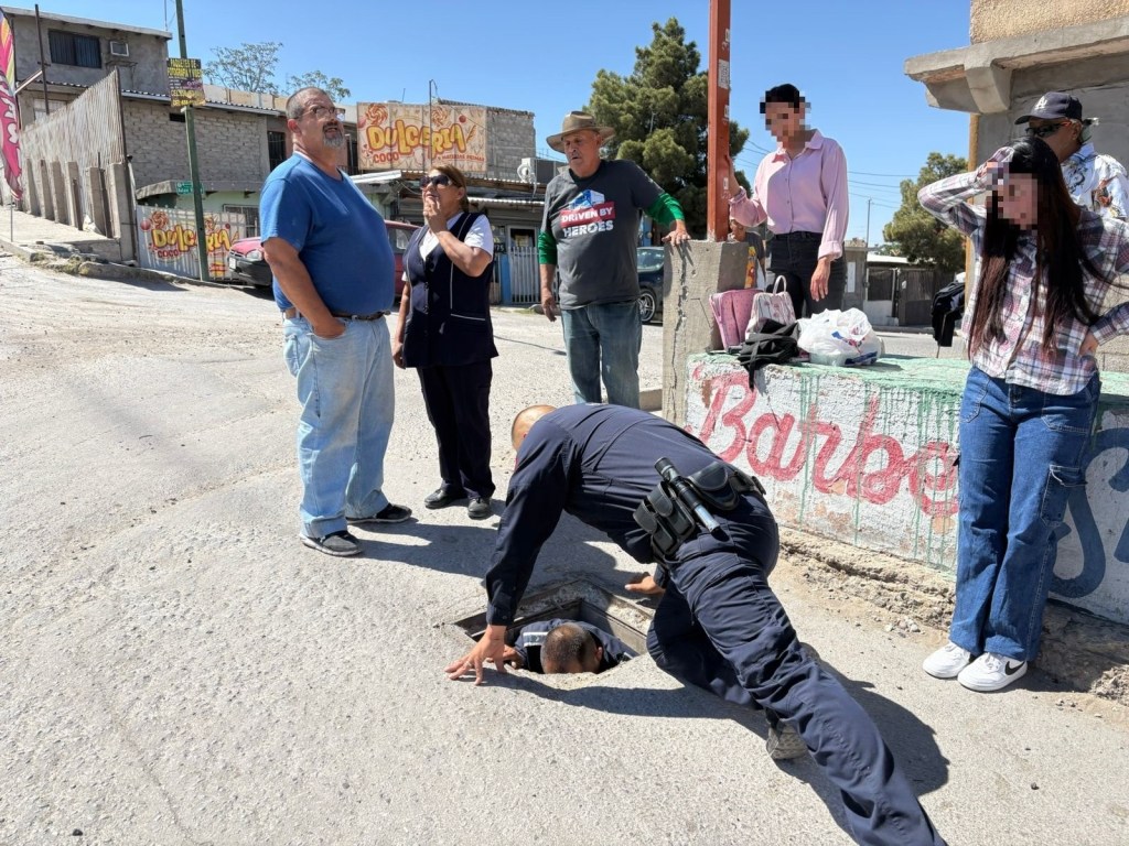 Agentes municipales acudieron al cruce de División del Norte y Rafael Velarde tras un reporte al 911 sobre un perro atrapado en una alcantarilla.