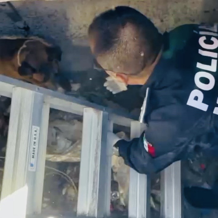 Los oficiales descendieron con una escalera, ofreciendo agua y croquetas al can para tranquilizarlo. Lograron rescatarlo ileso, reafirmando su compromiso con la protección animal.