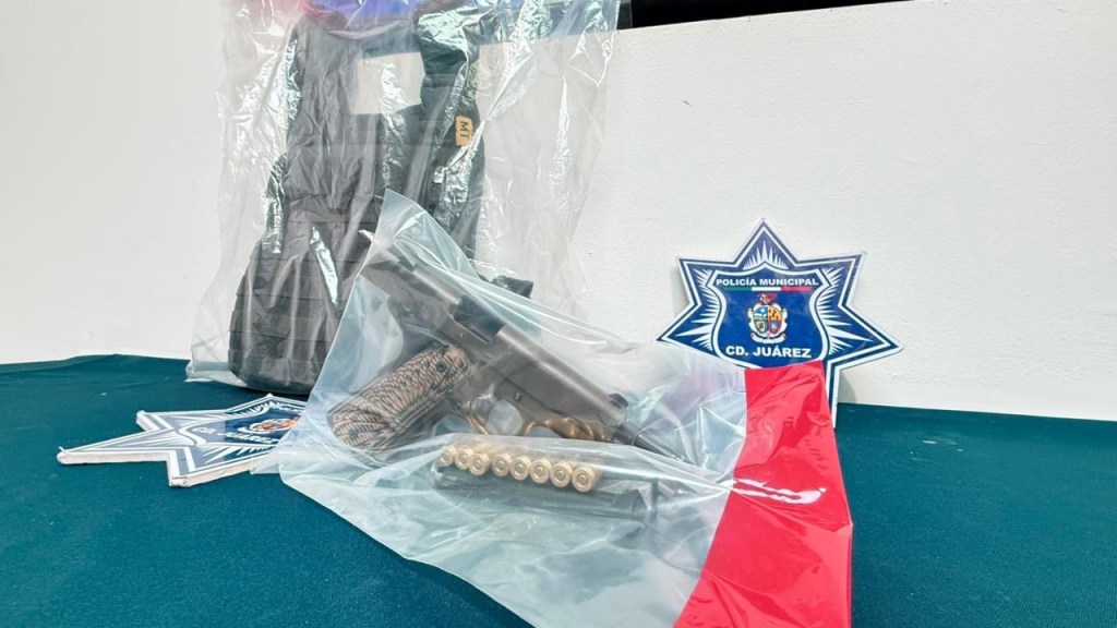 Al revisarlo, le encontraron una pistola calibre .45 con ocho balas y un chaleco táctico. Fue entregado a las autoridades para investigar si usó el arma en algún crimen.