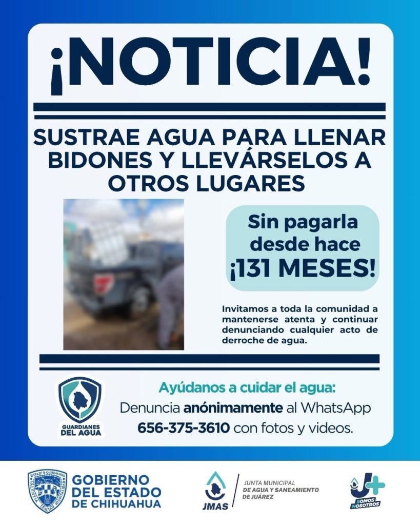 Mientras cientos batallan por pagar puntualmente, otros se cuelgan descaradamente. La Junta Municipal de Agua y Saneamiento pide reportar estos casos por WhatsApp al 656-375-3610 con fotos o video.
