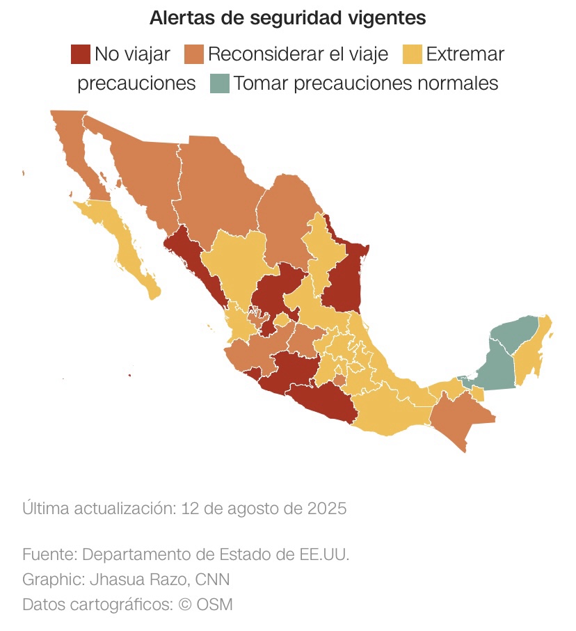 Los estados de la república que el gobierno estadounidense alerta no viajar son a Colima, Guerrero, Michoacán, Sinaloa, Tamaulipas y Zacatecas, por los altos índices de violencia en los que se encuentran.