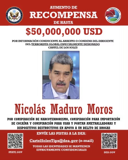 El gobierno estadounidense ofrece una recompensa de 50 millones de dólares por la captura de Nicolás Maduro, a quien señalan de ser el líder del Cártel de los Soles, el cual es considerado como terrorista por los Estados Unidos.