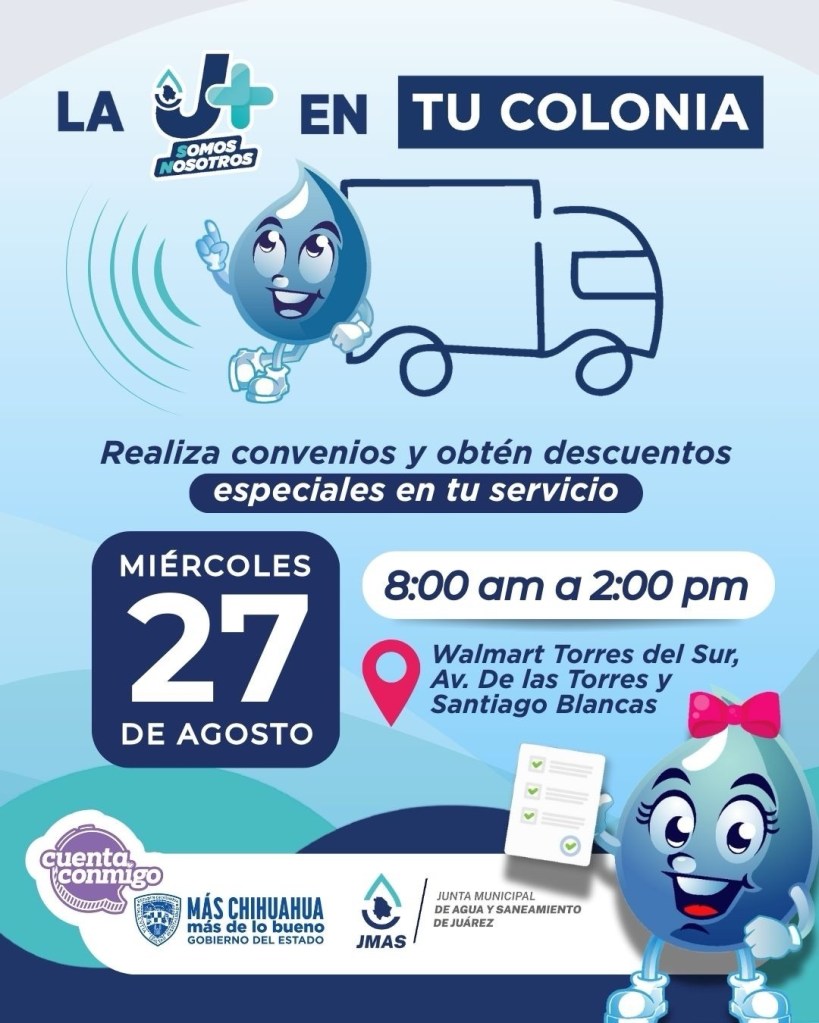 La JMAS instalará su Unidad Móvil este miércoles 27 de agosto en Walmart Torres Sur para ofrecer atención personalizada a vecinos con adeudos en servicio de agua potable.