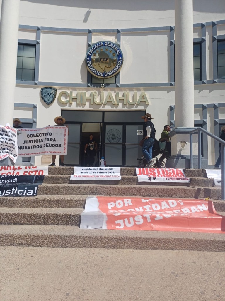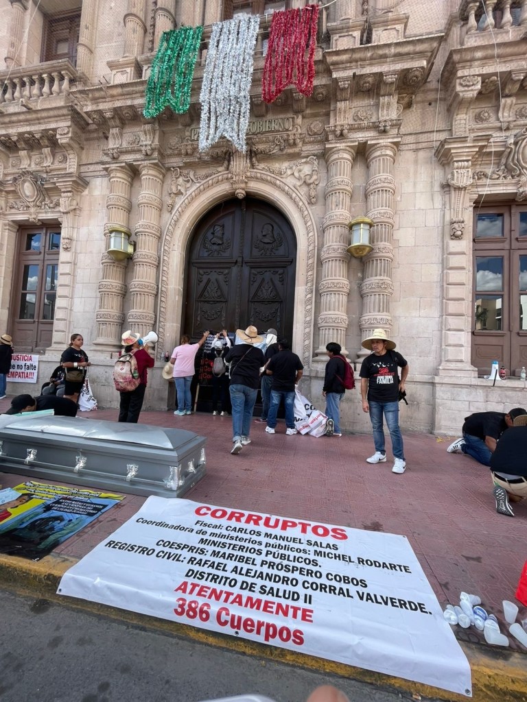 Familiares del colectivo Justicia para Nuestros Deudos, protestaron en la ciudad de Chihuahua contra las autoridades estatales, buscando justicia para 386 difuntos apilados en el crematorio Plenitud en Ciudad Juárez.