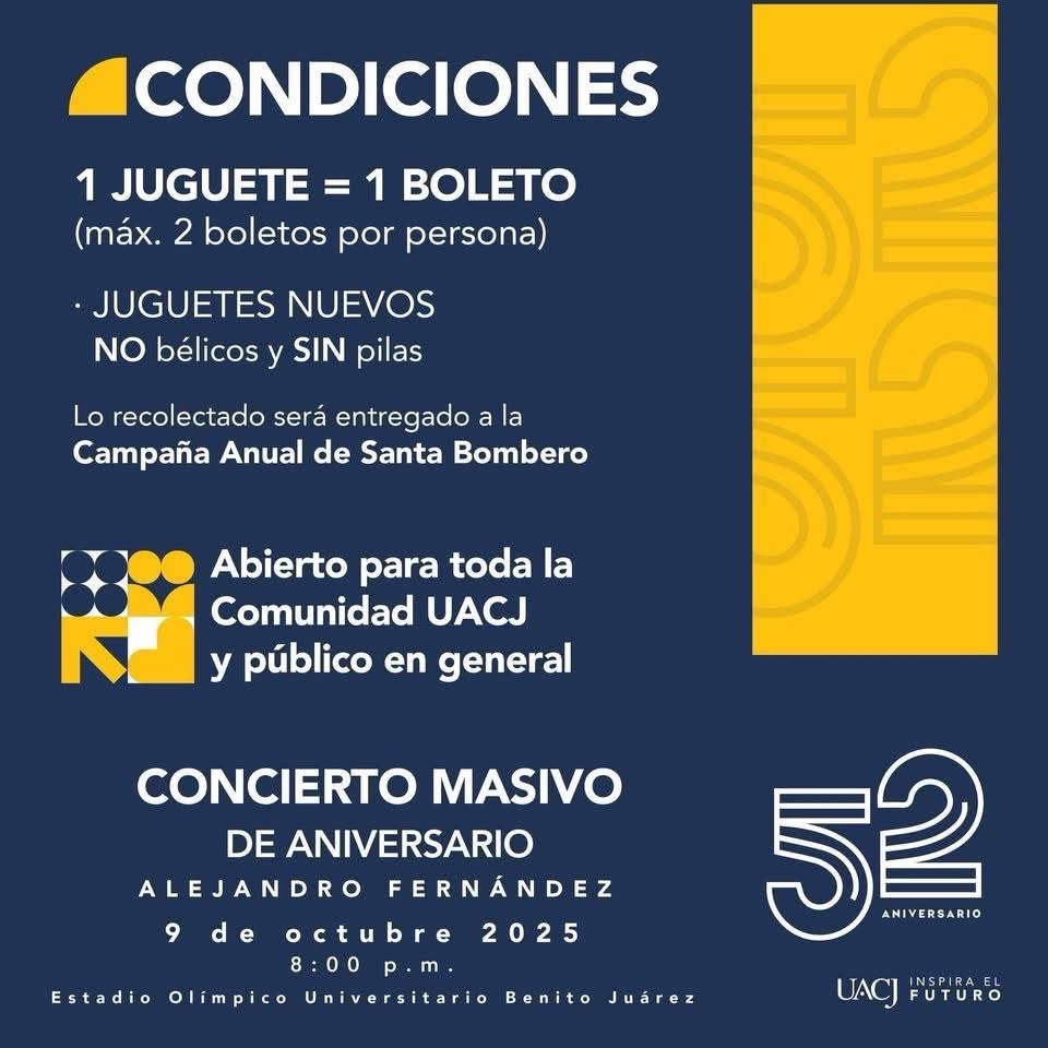 La Universidad Autónoma de Ciudad Juárez confirmó que Alejandro Fernández cantará en Ciudad Juárez el próximo 9 de octubre, dentro del Estadio Olímpico Universitario Benito Juárez, para celebrar su 52 aniversario.