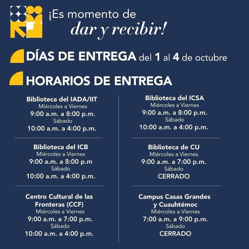 Los juguetes serán recibidos en IADA/IIT, ICB e ICSA, bibliotecas universitarias, campus de Casas Grandes y Cuauhtémoc, además del Centro Cultural de las Fronteras. Todo se destinará a la colecta de Santa Bombero.