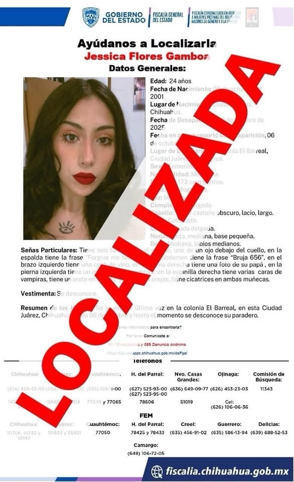 Jessica Flores fue localizada por la Fiscalía de la Mujer luego de permanecer desaparecida desde el 6 de octubre en la colonia El Barreal, generando preocupación.