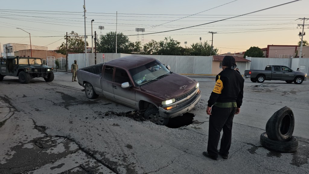 En las calles Bolivia y Reforma de la colonia El Barreal, un vehiculo cayó en un socavón provocado por las recientes lluvias.