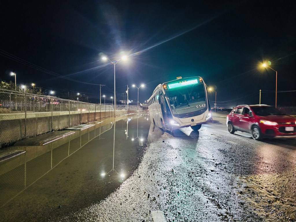 Un camión del JuárezBus cayó en un socavón la noche del sábado, sobre el bulevar Manuel Talamás Camandari, entre Refugio de la Libertad e Independencia.
