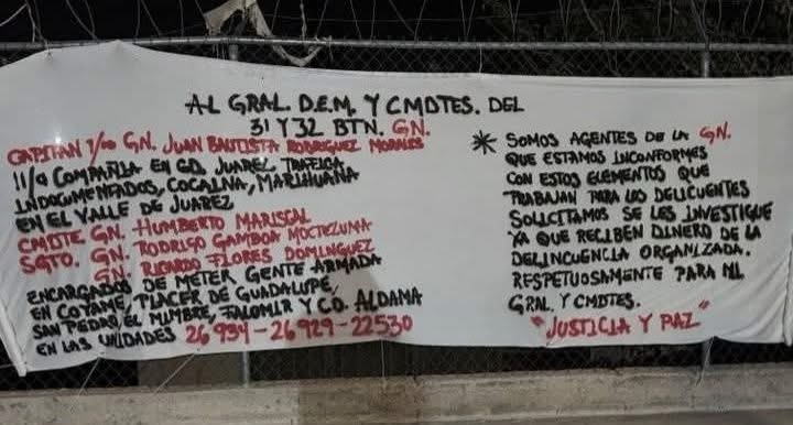 Esta noche dejaron una manta donde se menciona a varios mandos de la Guardia Nacional de tráfico de drogas y generar violencia en varios municipios del estado de Chihuahua.