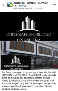 CUIDADO. Existe en la ciudad una empresa fraudulenta que se anuncia a través de Facebook como vendedora de automóviles en abonos fáciles denominada DRIVESAFE MOBILIDAD FINANCIERA, la cual está ubicada en la Avenida Tecnológico, número 3945, a un costado de Evobike. Se trata de una empresa fraudulenta que ya tiene hasta la fecha decenas de denuncias por el delito de fraude en la Fiscalía Zona Norte. Son muchas más las familias o personas afectadas las que aún no han interpuesto la denuncia porque las traen vueltas tras vuelta prometiéndoles lo que no les van a cumplir.