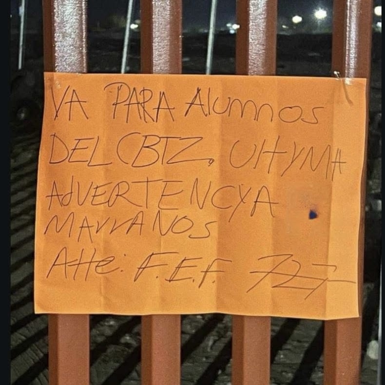 El texto decía: “Va para los alumnos CBTZ, última advertencia marranos, atte FEF 727”, según el reporte preliminar recibido en Puerto Alicante y Lote Bravo por las autoridades.