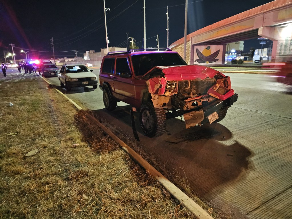 Esta noche, el conductor de una Jeep Cherokee color roja provocó un choque al intentar rebasar y cambiar de carril sin precaución sobre el bulevar Juan Pablo II.