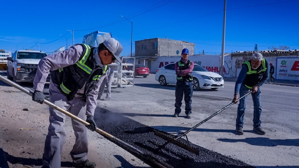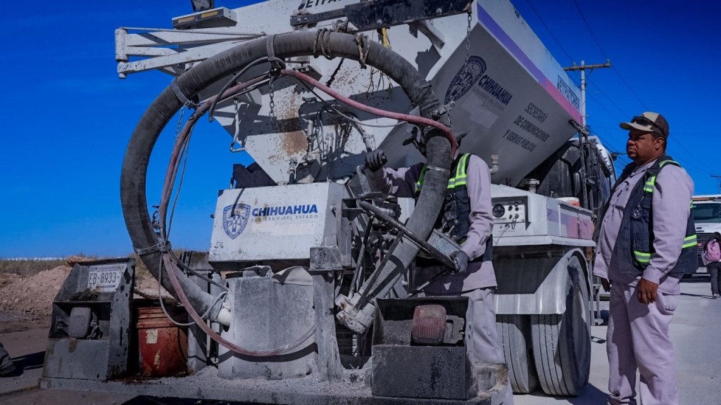 La Junta de Agua y Saneamiento de Juárez informó que, con apoyo de Obras Públicas del Estado, se utilizó maquinaria Jet Patch para agilizar la mezcla y colocación del pavimento, logrando avanzar de manera más eficiente en la rehabilitación.