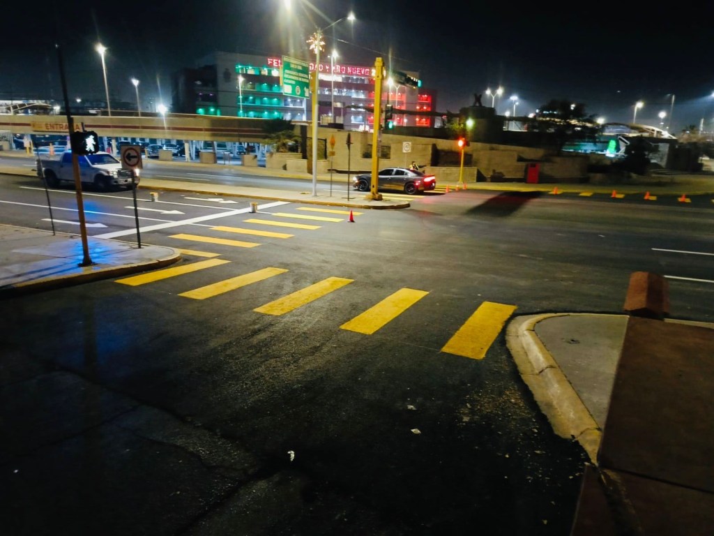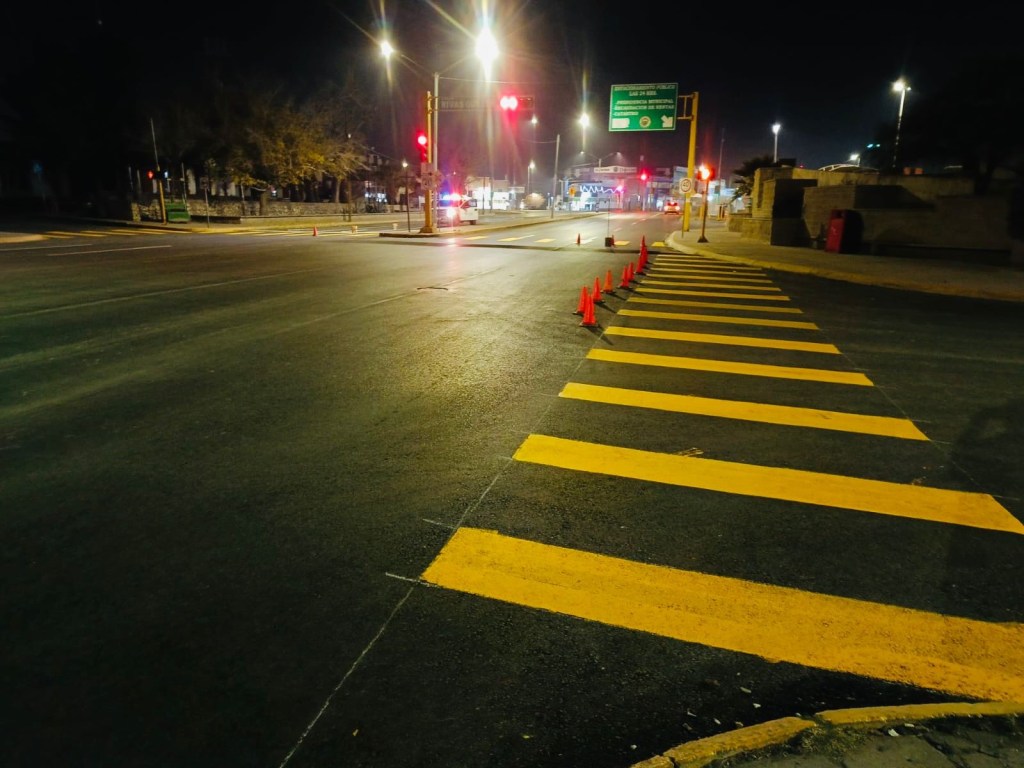 Las acciones se llevaron a cabo durante el turno nocturno, atendiendo pasos peatonales, líneas de alto y cordones de banquetas, con el objetivo de mejorar la visibilidad y seguridad para automovilistas y peatones.