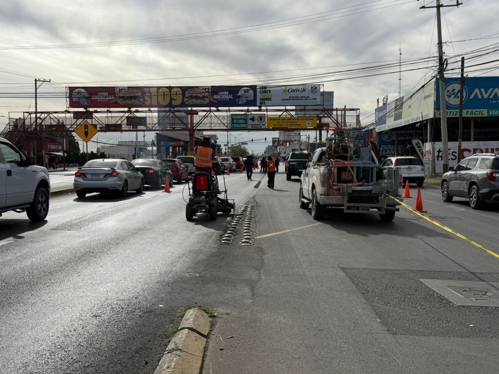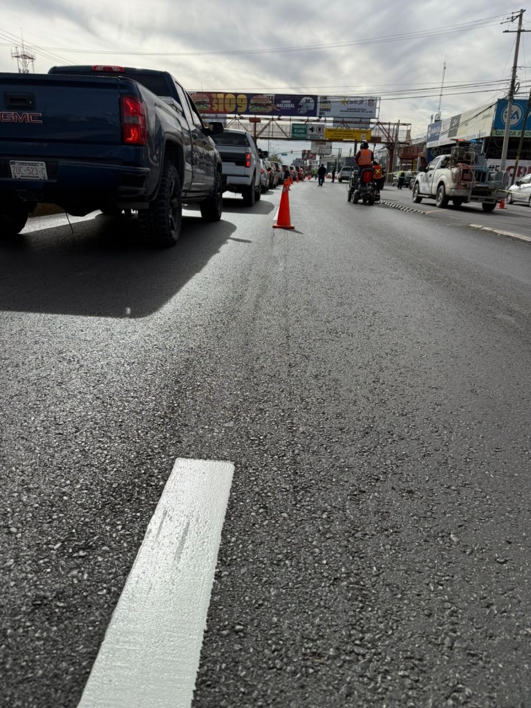 La Coordinación General de Seguridad Vial realizó pintura y señalización horizontal en la avenida Tecnológico, del Puente Rotario a Pedro Rosales de León, sentido norte a sur, para mejorar carriles y circulación vehicular urbana.