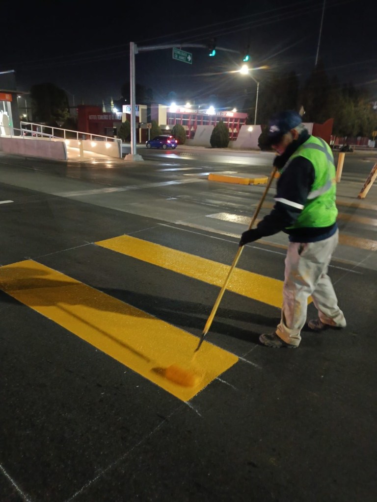 En trabajos nocturnos, en el cruce de Tecnológico y Simona Barba, se pintaron pasos peatonales, líneas de frenado, flechas y se colocaron estoperoles, reforzando la cultura vial.