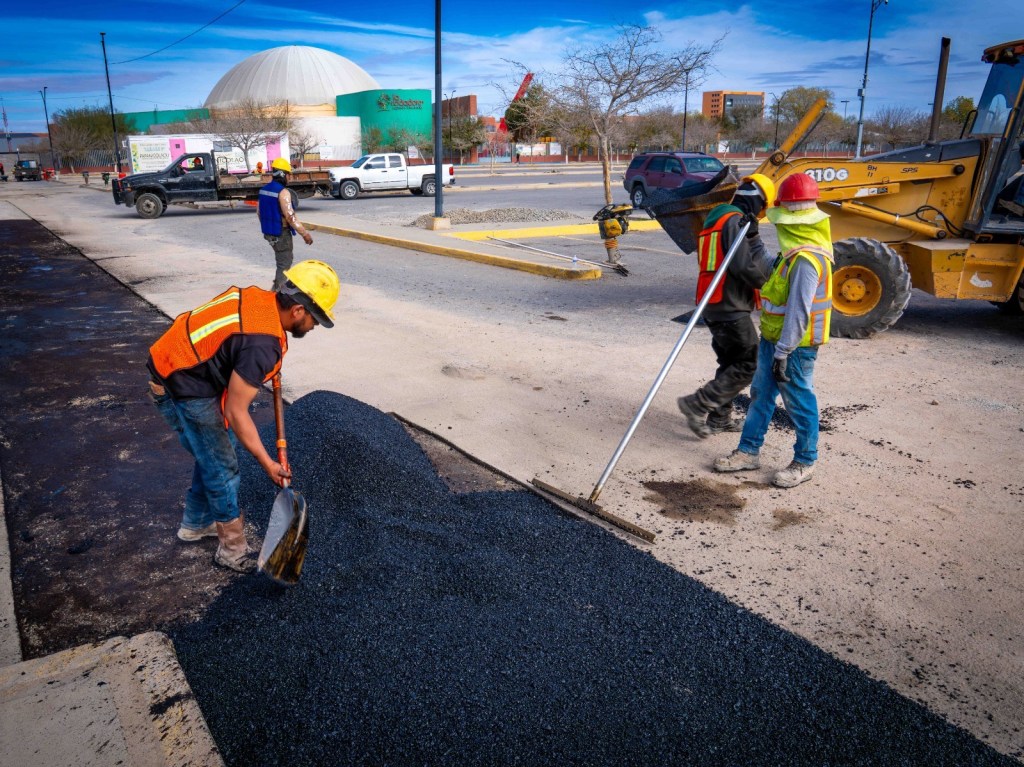 Las labores se concentran en el estacionamiento del Parque Central Poniente y en la calle Jesús Soltero Lozoya, donde cuadrillas aplican carpeta asfáltica para mejorar accesos y vialidades internas.