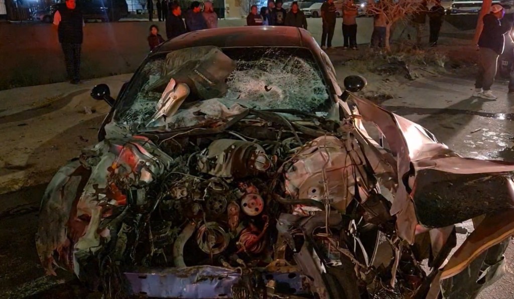 El accidente ocurrió sobre la calle Puerto Tarento, donde un camión de transporte de personal con numero económico 11095, sin matrículas, se impactó de frente contra un Dodge Challenger.