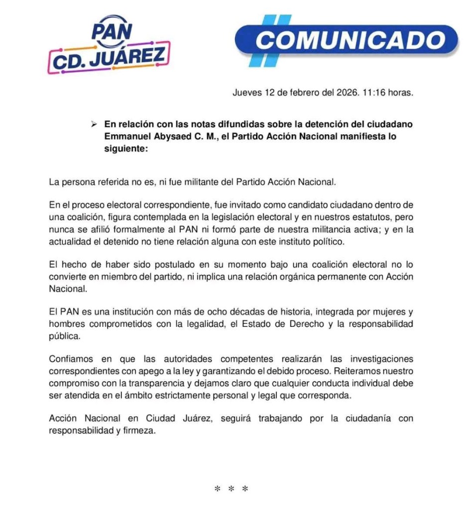Luego de la detención de Emanuel Abysaed C. M. y su consignación ante la Fiscalía General del Estado por daños y amenazas, el Partido Acción Nacional en Ciudad Juárez aclaró que no es militante.