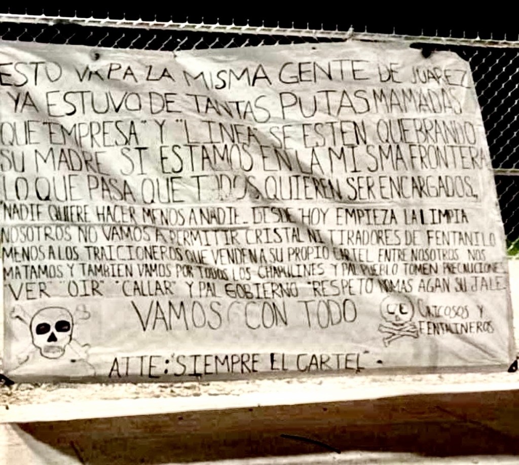 El mensaje está dirigido a vendedores de cristal y fentanilo en la frontera con hacer una “limpia”, además de pedir a las autoridades que hagan su trabajo. La manta fue firmada sin precisar quién la había colocado como en otras ocasiones.