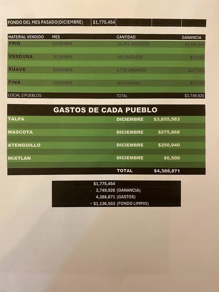 Los registros a los que tuvo acceso el periodico El Universal, elaborados en hojas y formatos digitales, incluyen ingresos por venta de drogas como marihuana, cocaína, metanfetamina y fentanilo, así como por control de máquinas tragamonedas en el municipio de Tapalpa, donde el CJNG tenía presencia. En diciembre de 2025, dichas ventas habrían generado cerca de 8.8 millones de pesos.