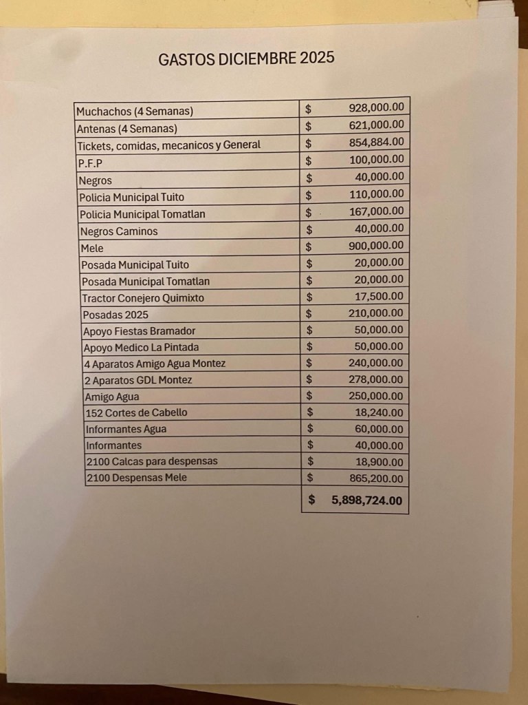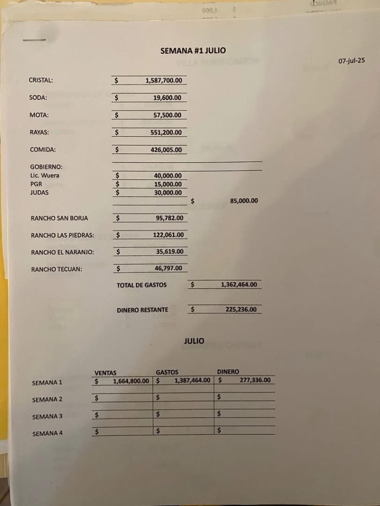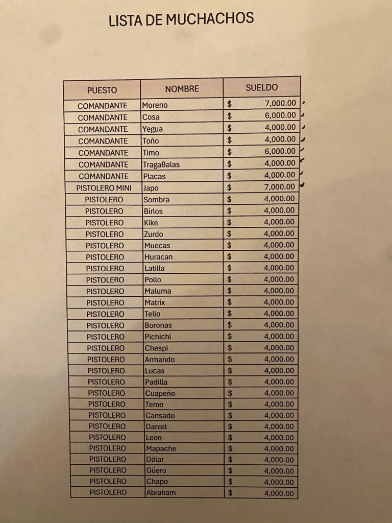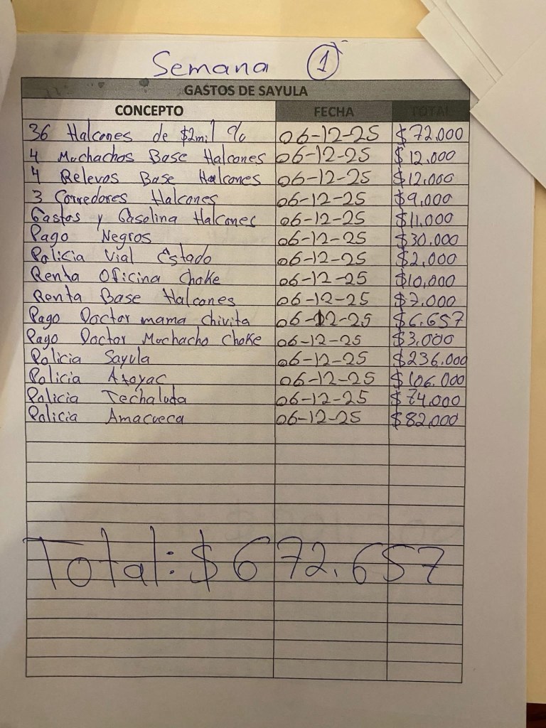La narconómina también detalla pagos semanales a entre 30 y 32 halcones (vigilancia), 26 sicarios con montos fijos e incluso pagos a policías municipales en varios municipios de Jalisco, así como gastos por gasolina, renta de bases operativas y mantenimiento de vehículos.