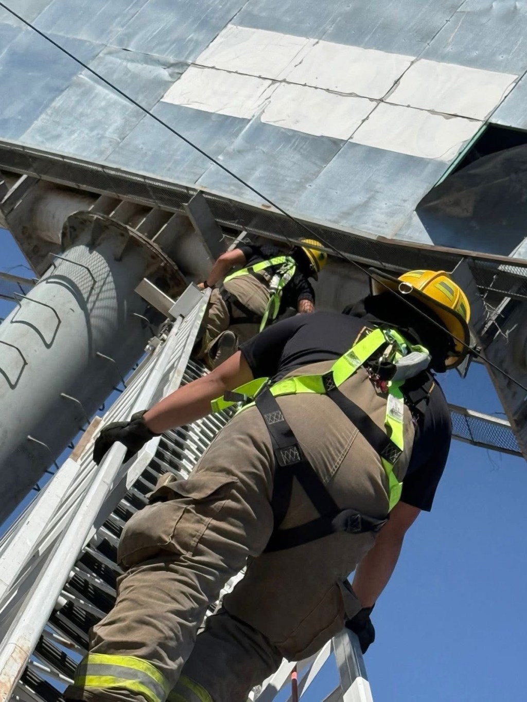 Elementos de Protección Civil retiraron dos láminas sueltas de un anuncio panorámico en la colonia La Cuesta. El material colgaba a veinticinco metros de altura hoy.