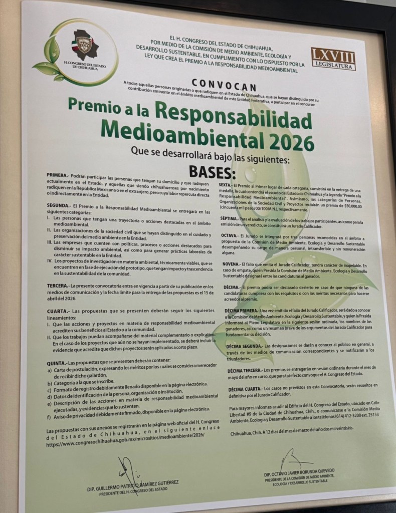 El director de la Dirección de Ecología, César Díaz Gutiérrez, participó en una reunión del Congreso del Estado de Chihuahua donde se presentó la convocatoria del Premio a la Responsabilidad Medioambiental 2026.