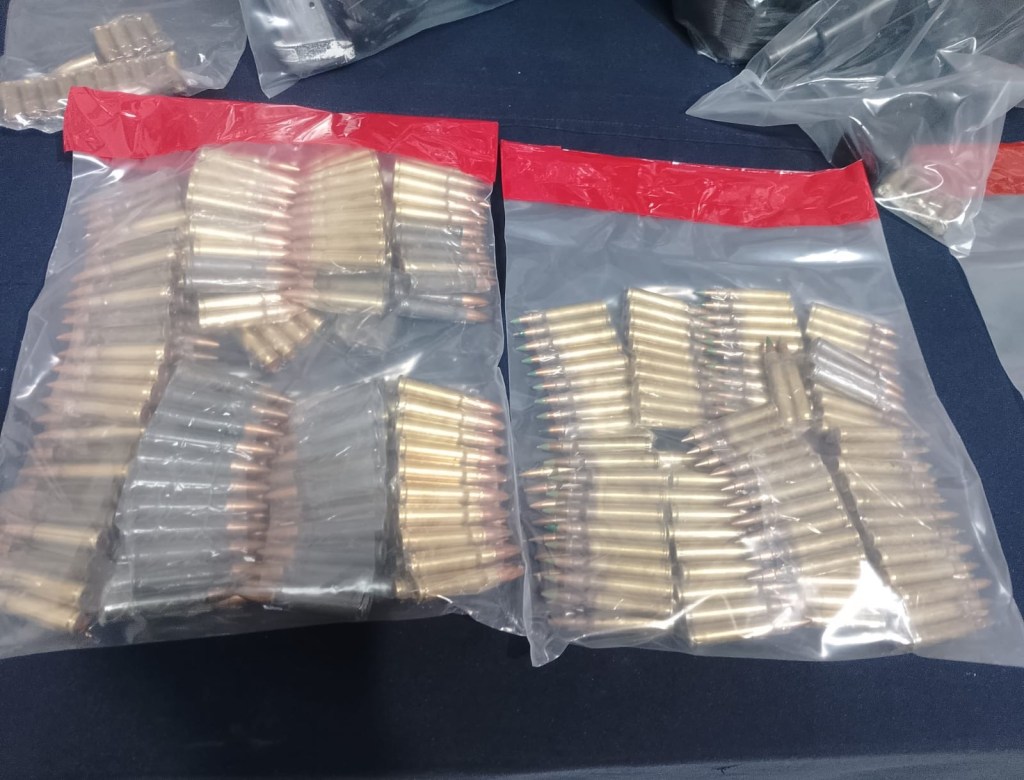 Dentro del vehículo aseguraron un arma de fuego calibre 9 milímetros, otra calibre .40 con cargador abastecido, además de cartuchos calibre .40, .223 o 5.56, 7.62×39 y .308, así como cargadores y chalecos tácticos.