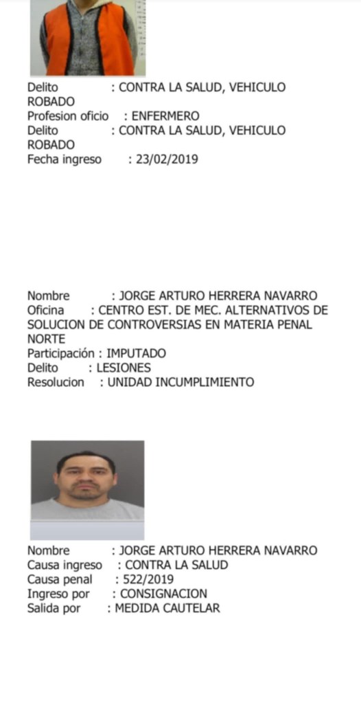 FICHAS. Tenemos evidencia a través de las fichas de detención en las que se ha visto involucrado. El día 12 de octubre del 2012, fue detenido por violencia familiar y lesiones. El día 1 de octubre del 2014 se le detuvo por violencia familiar, fue acusado por su ex pareja de golpearla a ella y a su hijo. El 23 de febrero del 2019 fue detenido por delitos contra la salud y posesión de un vehículo con reporte de robo. Pese a esos delitos graves continuó laborando en el Seguro Social.