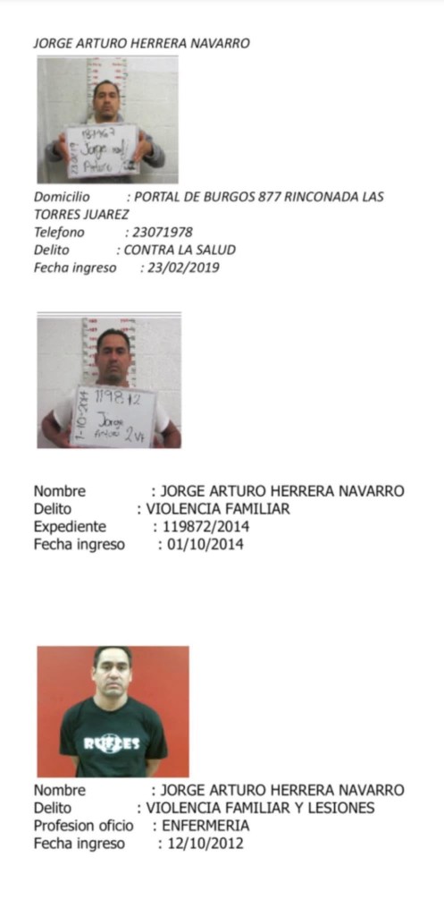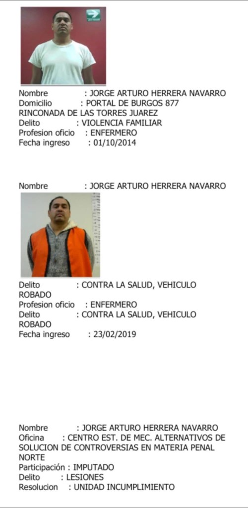 DELINCUENTE. Resulta increíble e indignante que un delincuente de nombre Jorge Arturo Herrera Navarro, de oficio enfermero y el cual ha estado ya varias veces detenido y fichado por Delitos contra la Salud, Lesiones y Violencia Familiar, sea actualmente el líder del Sindicato de los Trabajadores del Instituto Mexicano del Seguro Social (IMSS) en el estado de Chihuahua.