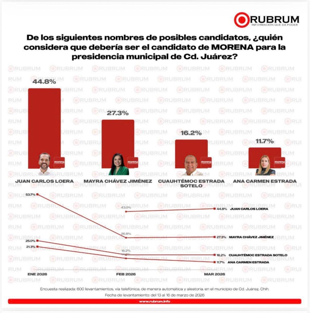 El senador de Morena, Juan Carlos Loera destacó los resultados de la encuestadora Rubrum, que lo colocan como el perfil mejor posicionado de Morena para la presidencia municipal de Ciudad Juárez en 2027.