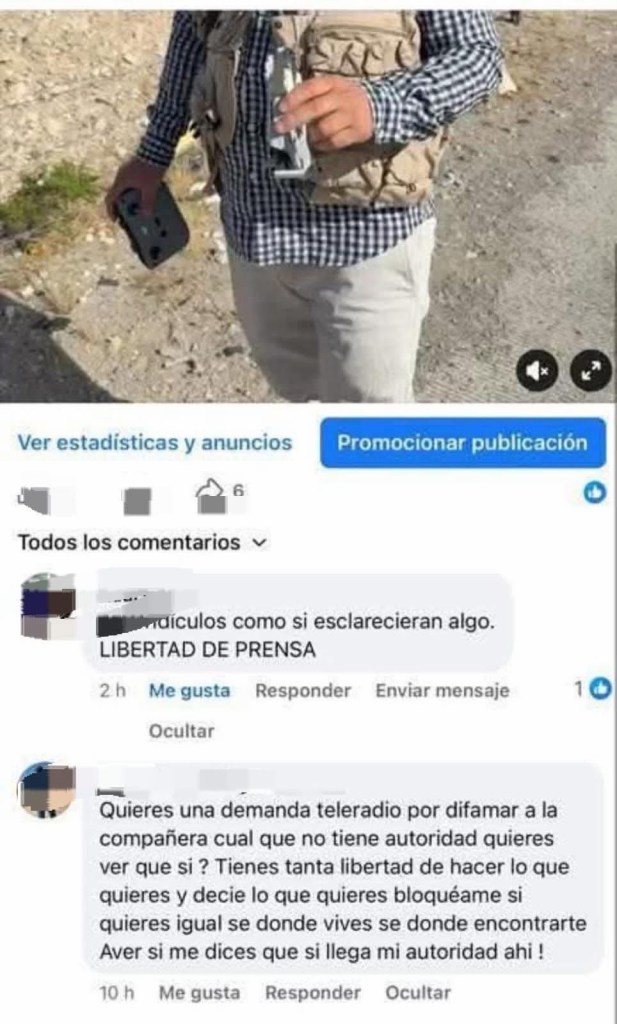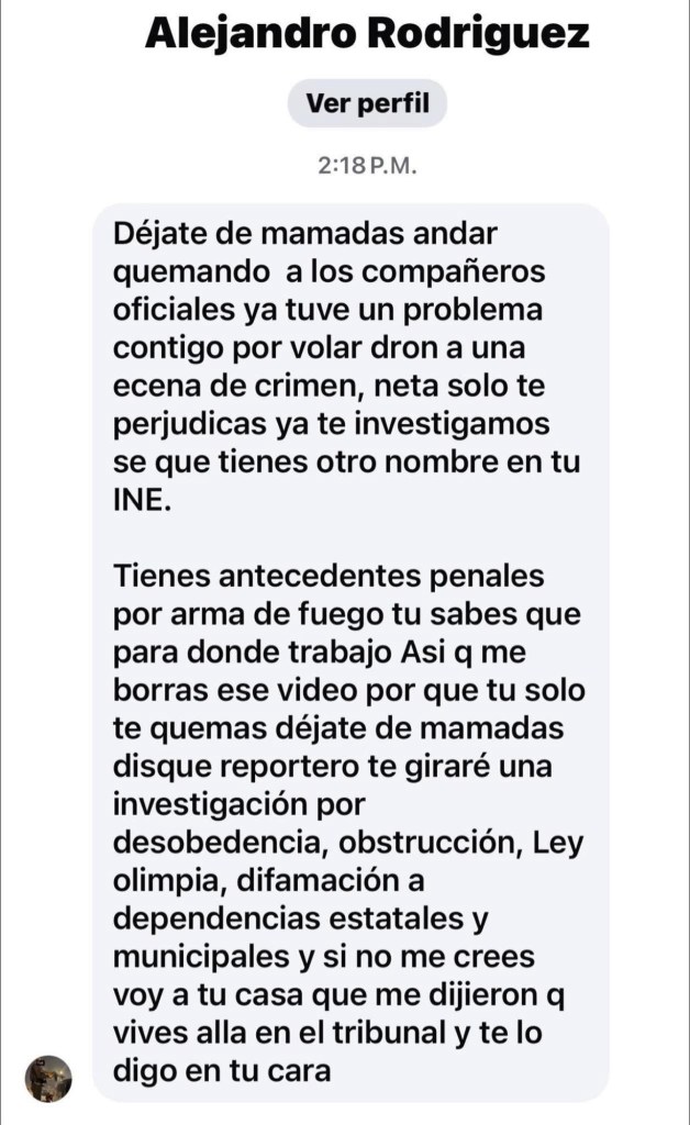 En las capturas difundidas, el presunto policía lanza advertencias, asegura haber investigado al periodista y afirma conocer datos personales y domicilio, lo que eleva el nivel de intimidación y riesgo.