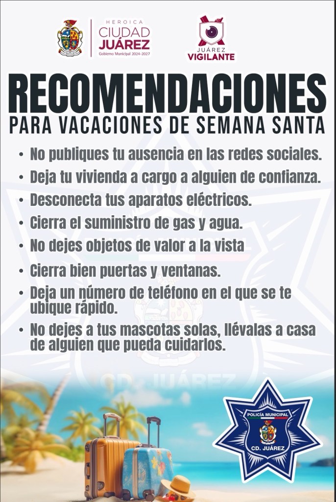 La Secretaría de Seguridad Pública Municipal lanzó un llamado a la ciudadanía para no bajar la guardia en vacaciones de Semana Santa y evitar robos o accidentes.