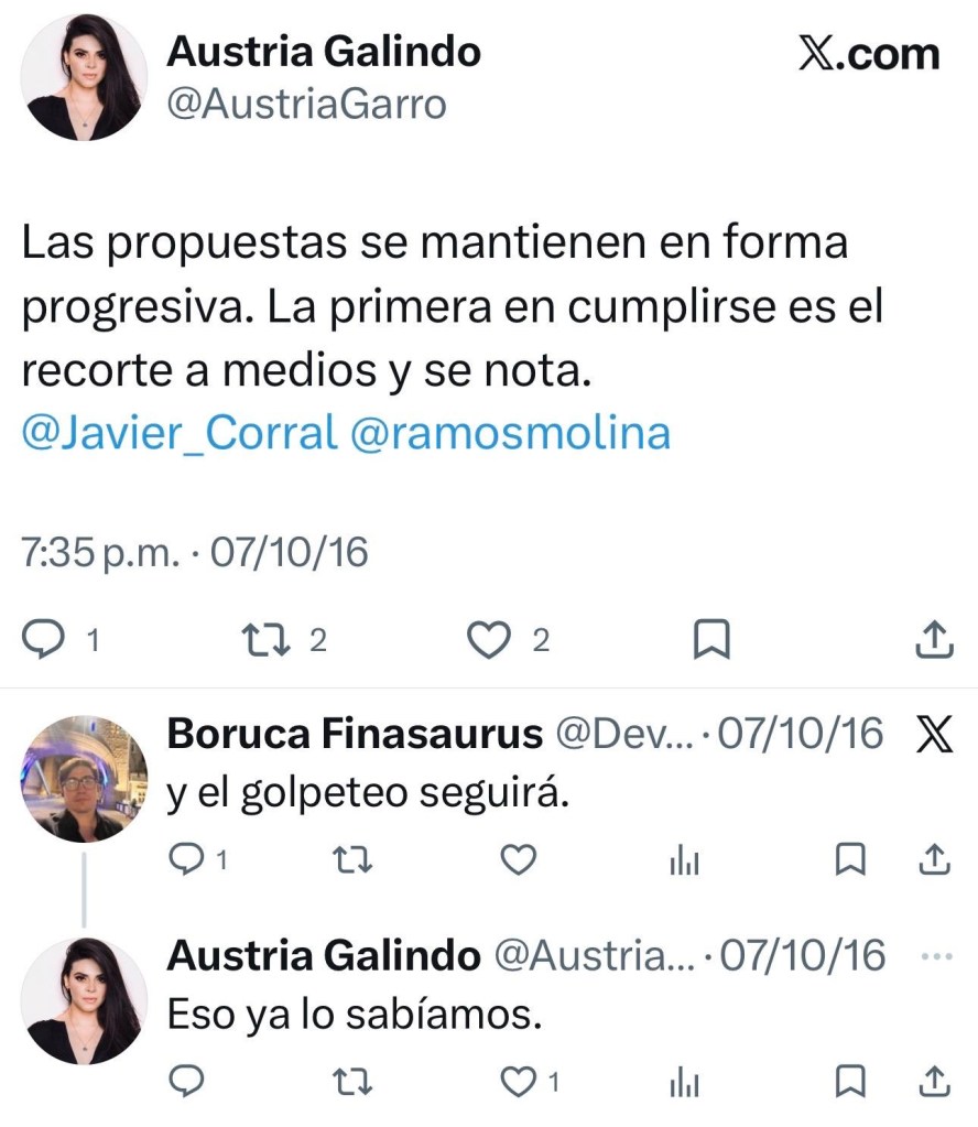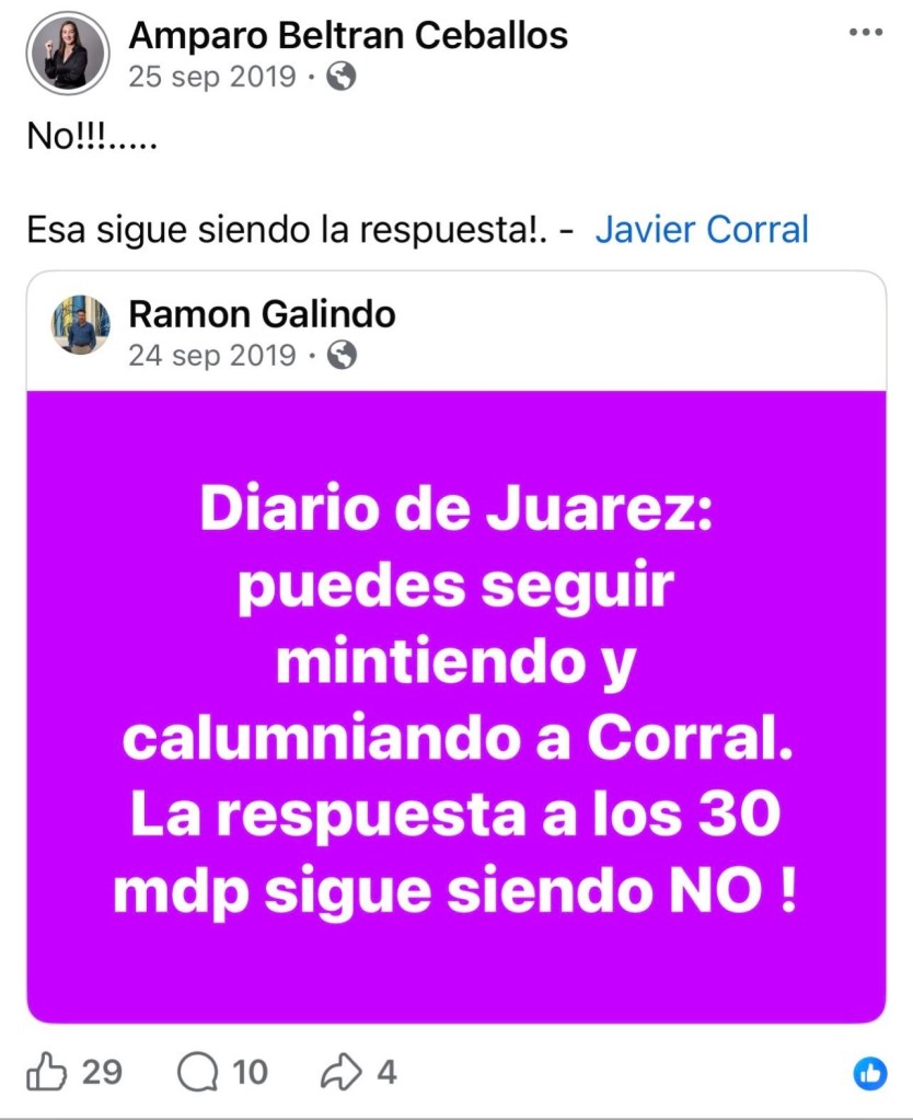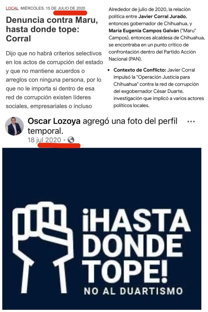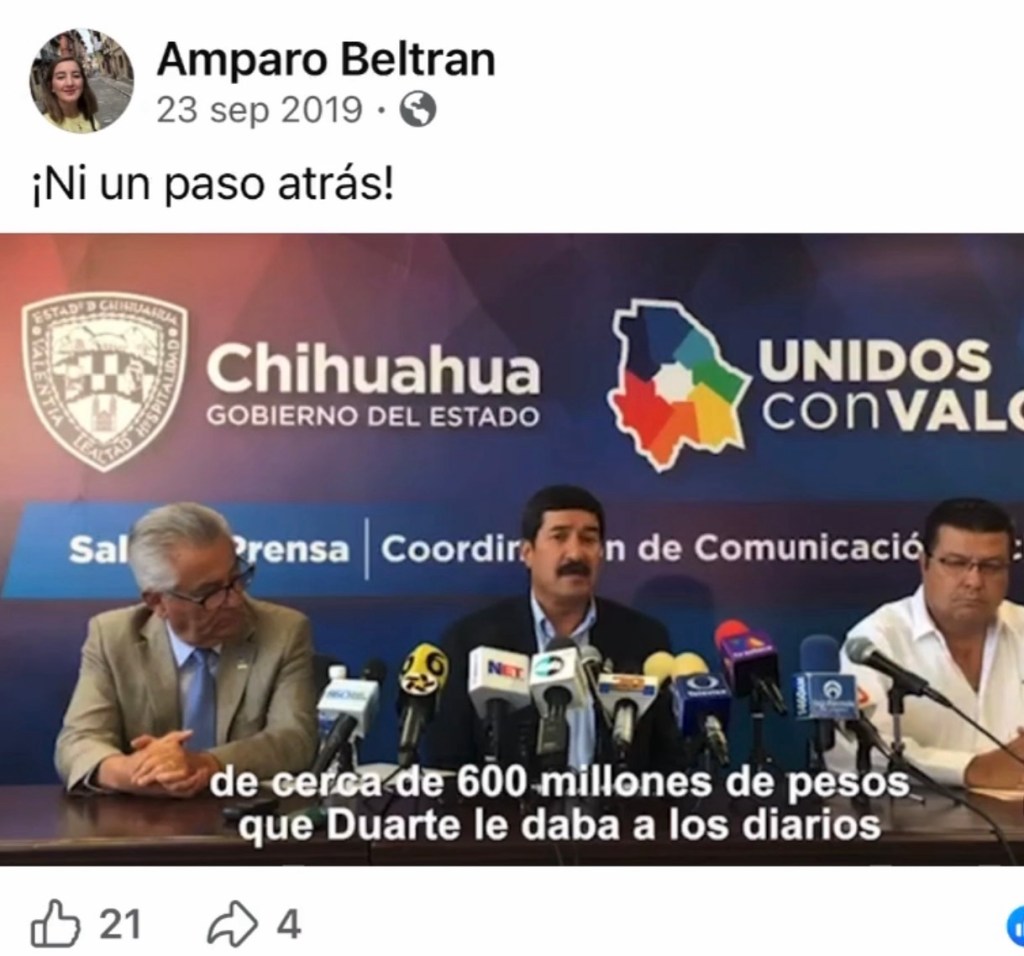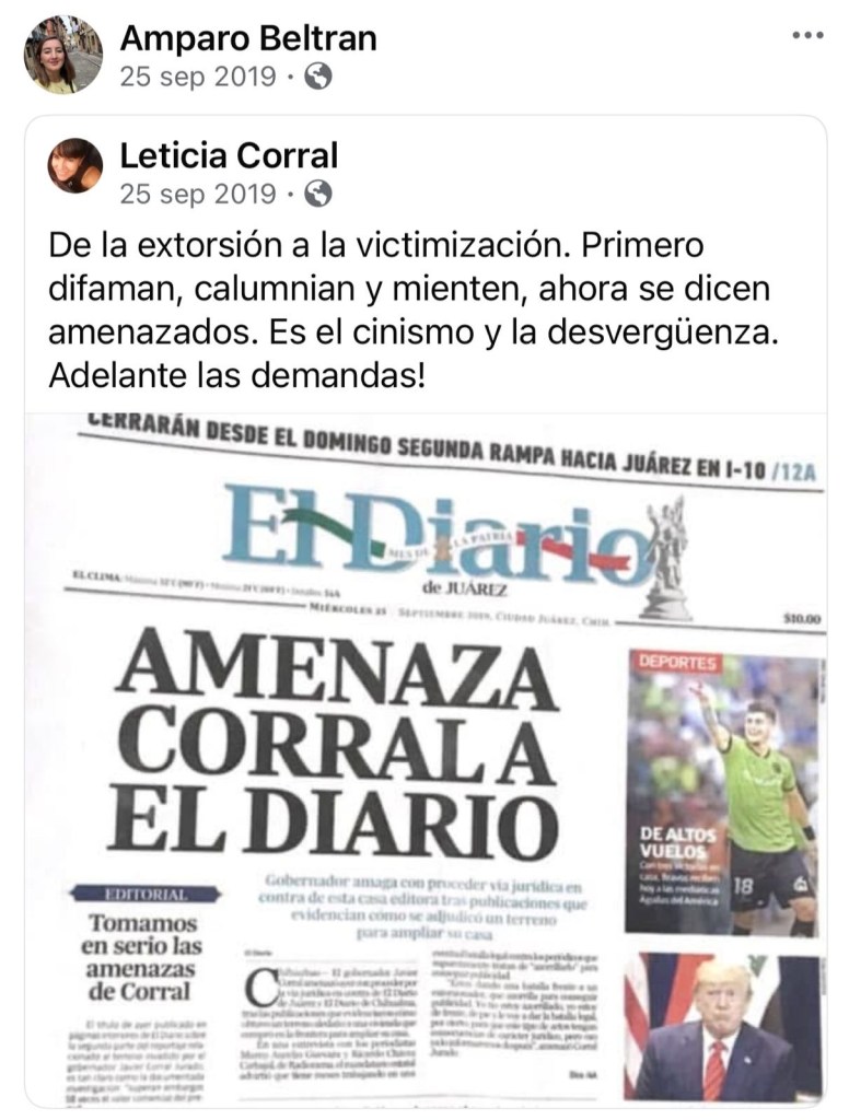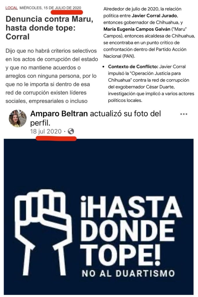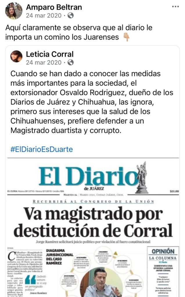 SUPLICA. En un encabezado en El Diario de Juárez tanto de nuestra ciudad como en la ciudad de Chihuahua, la Gobernadora aseguraba que “A diario recibo ataques de Corral”. Amparo Beltrán público: “Me molesta y me frustra que un gobierno panista siga financiando al diario. De Cabada lo podía esperar, pero no de usted, alcaldesa Maru Campos! No lo haga!”. Varios panistas a sabiendas de que Javier Corral utilizó la justicia como venganza contra sus opositores, aplaudieron la manera en que esta se manejó, aún y cuando fueran miembros de su partido, lo cual actualmente quedó demostrada la farsa de Javier Corral.
