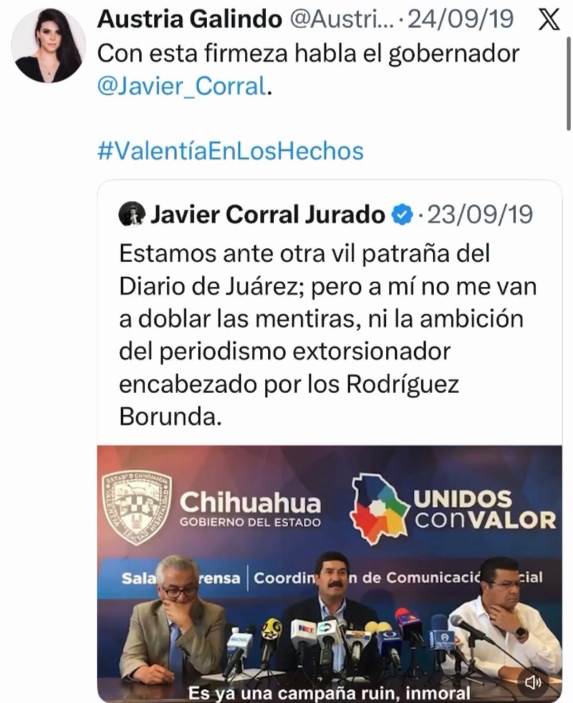 SORPRESA. Buscando en mi archivo periodístico me encontré que además de Amparo Beltrán, otro personaje perteneciente al Partido Acción Nacional (PAN), Austria Galindo, que pretende ser candidata a la Presidencia Municipal por el PAN, no se midió en apoyar la persecución que sufrió la gobernadora Maru Campos Galván a manos del peor gobernador de Chihuahua, ex panista hoy morenista, Javier Corral Jurado.