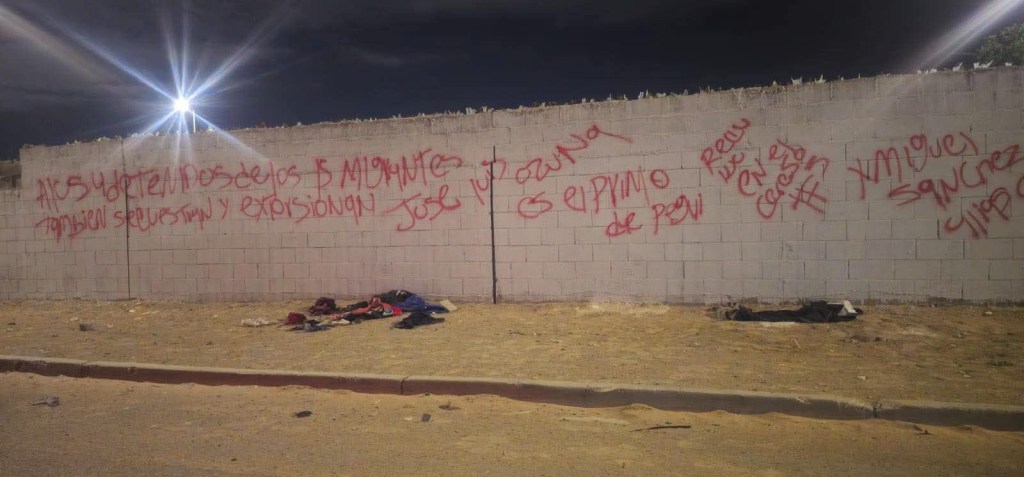 El mensaje, escrito con letras rojas en una pared, decía: “A los 4 detenidos de los 15 migrantes también secuestran y extorsionan José Luis Ozuma es el primo de Pegui recibido en el Cereso #5 x Miguel Sánchez Cabrera El Barba se encargó de levantar migrantes y empresarios y Alejandro Villarreal alias El Primo 45 él es el encargado”.